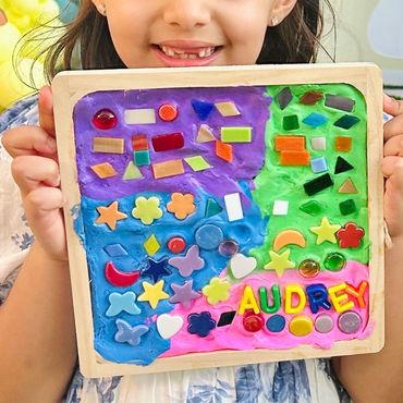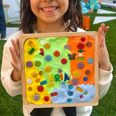 Our Mosaic Tile Party lets kids create a real piece of art they’re proud to take home. Each child designs and builds their own mosaic, choosing from a wide variety of colorful tiles and arranging them into a frame however they like! It’s hands-on, creative, and unique! The kids stay focused building their design piece by piece and love seeing it come together!